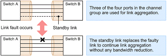The standby link functionality replaces a faulty port with a standby port in the same channel group to maintain the number of active ports in the channel group. This functionality can prevent a reduction of available bandwidth if a fault occurs.