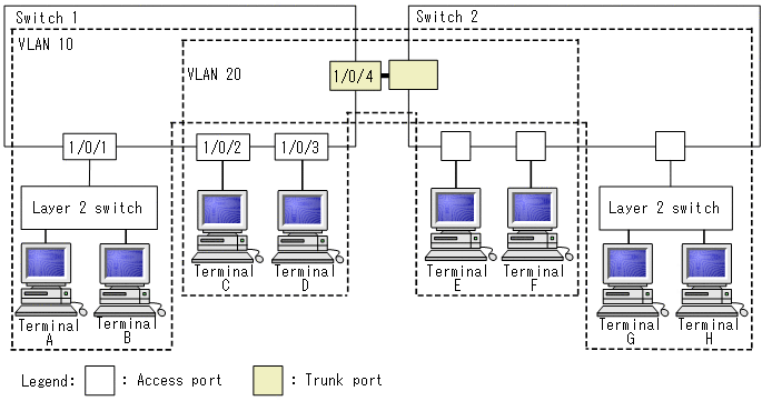 Port 1/0/1 is set for port VLAN 10. Ports 1/0/2 and 1/0/3 are set for port VLAN 20. Port 1/0/4 is the trunk port, and all VLANs are set for it.