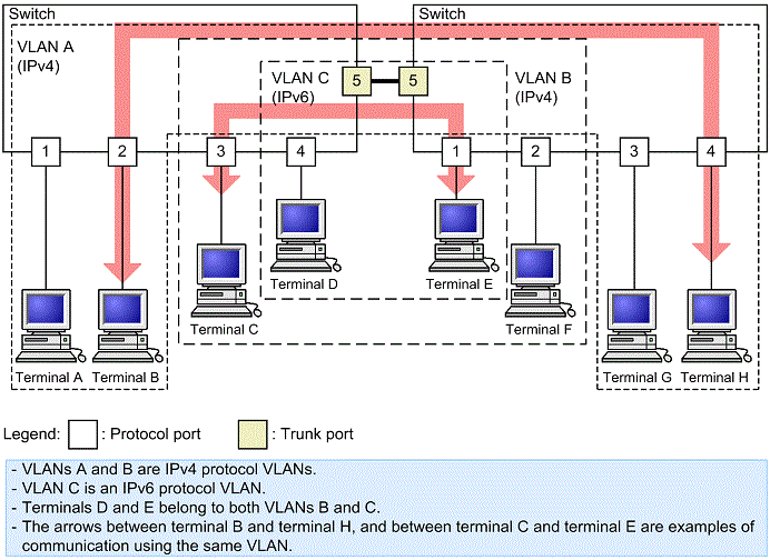 The figure below shows an example protocol VLAN configuration. In the following example, VLANs A and B are configured with the IPv4 protocol, and VLAN C is configured with the IPv6 protocol.