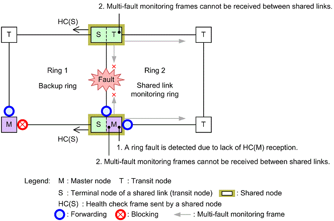Shared nodes can no longer receive multi-fault monitoring frames between shared links, but because reception is still possible on the other ring port, multi-fault monitoring continues.
