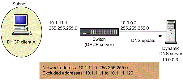 Sets a zone for the 11.1.10.in-addr.arpa. domain for reverse DNS resolution, and specifies the DNS server defined in step 5 (10.0.0.3) as the dynamic DNS server.