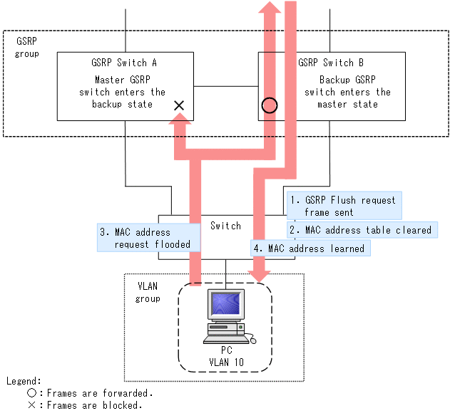 When switching on GSRP switch, you cannot immediately resume end-to-end communication by simply controlling the switching of forwarding and blocking for the frame. However, that is not enough to immediately resume end-to-end communication, because the MAC address entries in the MAC address tables in the neighboring switches are still registered for the previous master GSRP switch. To immediately resume communication, the MAC address table entries on the neighboring switches need to be cleared when the GSRP switches change.