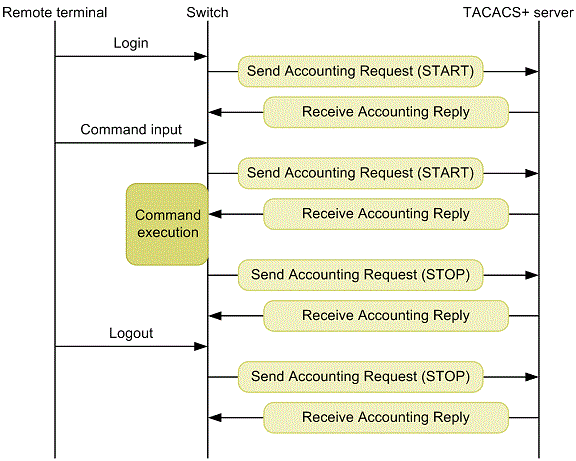 The following figure shows the processing sequence when the system is configured to send accounting notices to a TACACS+ server in START-STOP transmission mode for login accounting, and in STOP-ONLY transmission mode for command accounting.