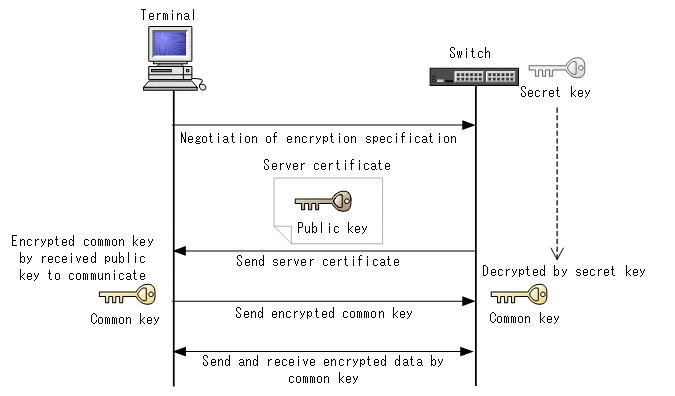 HTTPS can be used to protect the communication of Web authenticated login and logout operations from others. With Web authentication, communication is encrypted using the server certificate and key using SSL module mounted on the Switch, using a one-way authentication method that is based on the Switch as a server. If the following SSL is indicated, TLS is included. The following diagram shows the operation of SSL.