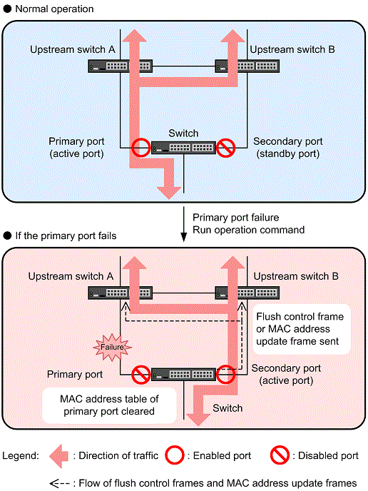 When switchover or switch-back occurs, all the MAC addresses learned on the previous active port are cleared, and the new active port starts communication. When the uplink port pair is configured to send flush control frames or MAC address update frames, the new active port sends either type of frame when switchover or switch-back occurs. If the port reset function is set, the old active port is temporarily brought down.