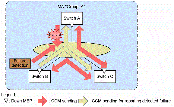 If a switch on which the CC functionality is used does not receive CCMs or a port on the applicable switch in an MA cannot communicate, a failure is determined to have occurred. When this happens, a CCM with a failure detection flag is sent to notify MEPs in the MA of the failure.