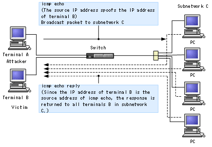 Directed broadcasts are not forwarded by default when the above configuration commands are not executed. If you set forwarding of directed broadcasts, you need to be aware that attacks might be directed against terminals as shown in the following figure.