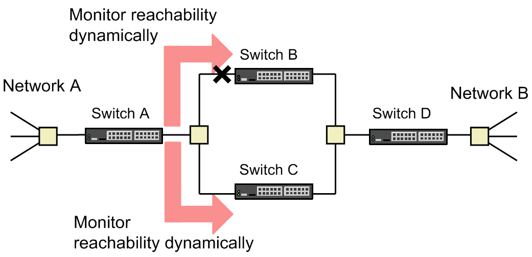 With dynamic monitoring, however, the monitoring functionality of Switch A detects that Switch B is unreachable although the interface on the Switch A side is normal. This enables switching to a static route via Switch C and ensures communication between Switch A and Network B.