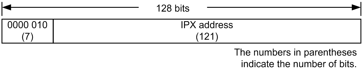This address format is used to convert an IPX address so that it can be used in IPv6. To support IPX, the upper 7 bits of the address format prefix are 0000 010. The following figure shows the format of an IPX-compatible address. Note that IPX compatible addressing is deprecated by RFC3513.