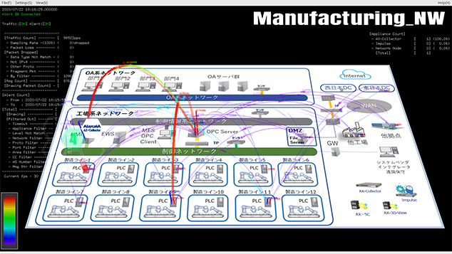 AX-Sensorで収集したトラフィック情報を地図やネットワーク構成図上に3D表示することで、システム全体の通信状況を直観的に把握(サーバ上で動作するソフトウェア)