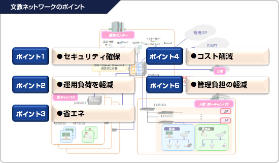 キャンパスネットワークを構築するポイントは、セキュリティを確保しながら、質の高い教育環境、教職員の日常業務の負担軽減などを実現し、環境負荷の軽減と低コストなネットワークを構築することです。 アラクサラのAXシリーズは、キャンパスネットワークを構築する上で最適なネットワークインフラを提供します。