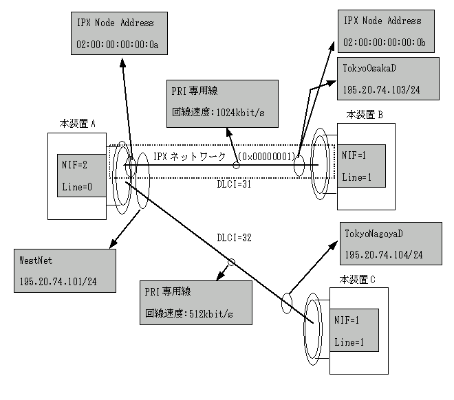 開始タイムスロット番号17,タイムスロット幅8,タイムスロット名Tokyo2TS((64kbit/s/タイムスロット)×8=512kbit/s)9 タイムスロット名Tokyo2TSのタイムスロットにリンクレイヤプロトコル フレームリレーを定義し,PVC状態通知手順の方向をDCEに設定します。 10〜13 タイムスロット名Tokyo2TSのタイムスロットにDLCI名TokyoNagoyaDでDLCI 32を定義します。 14 TokyoOsakaDとTokyoNagoyaDをグループ名WestNetでグループ化します。 15,16 グループ名 WestNetのグループにIPアドレス195.20.74.101,サブネットマスク255.255.255.0を定義します。 17 IPXルーティングを使用可に設定します。 18〜20 WestNetのインタフェースにIPXルーティングインタフェース情報を定義します。 21 ノードアドレス02:00:00:00:00:0bのIPX-ARPを定義し,DLCI名TokyoOsakaDのDLCIを指定します。
