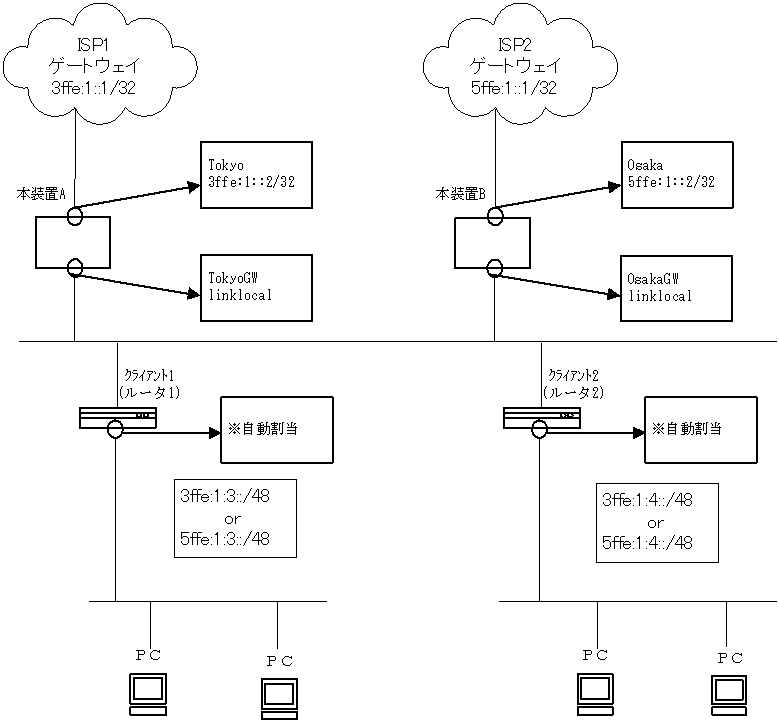 - 外部ネットワークのゲートウェイアドレスはISP1が3ffe:1::1/32,ISP2が5ffe:1::1/32とします。