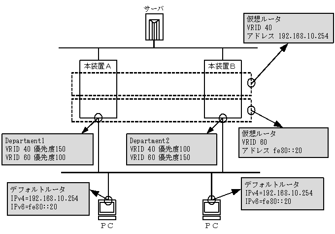 - 本装置AのインタフェースDepartment1に対してVRID40,仮想ルータアドレス192.168.10.254,優先度150のIPv4仮想ルータと,VRID60,仮想ルータアドレスfe80::20,優先度100(デフォルト)のIPv6仮想ルータを設定します。