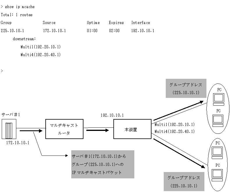 本装置でIPv4マルチキャストルーティング情報の設定を行った場合は,show ip mcacheコマンドを実行して宛先アドレスへの経路が存在していることを確認してください。存在しない場合,およびdownstreamが正しくない場合は,「5.4.2 PIM-DM,PIM-SM情報を確認する」〜「5.4.4 IGMP情報を確認する」について確認してください。