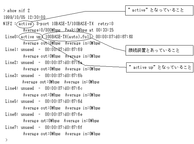- ”NIF1: active”でない,または”Line0: active up”でない場合は,「7.4.2 WAN回線の接続ができない」を参照してください。