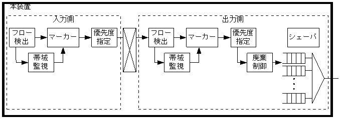 機能ブロック 機能概要 フロー検出 プロトコル種別やIPアドレス,ポート番号などの条件に一致するフローを検出します。 帯域監視 フローごとに帯域を監視して,帯域を超えたフローに対してペナルティを与えます。 マーカー IPヘッダ内のDSCPやTag-VLAN連携ヘッダのユーザ優先度の値を書き換える機能です。 優先度指定 フローをキューイングするキュー番号や,廃棄され易さを示すキューイング優先度を指定します。 廃棄制御 パケットの優先度とキューの状態に応じて,該当パケットをキューイングするか廃棄するかを制御します。廃棄制御は出力側だけの機能です。 シェーパ 各キューからのパケットの出力順序および出力帯域を制御します。シェーパは出力側だけの機能です。 機能ブロックの詳細について,次の節から説明します。
