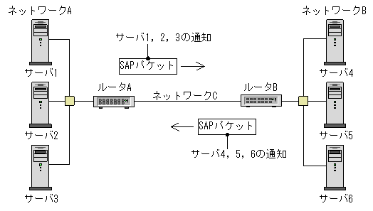 この図で,ルータAはサーバ4,5,6の存在をルータBからのSAPパケットで認識して,サーバ1,サーバ2,サーバ3に通知します。これによって,ネットワークC上はルータA,B間のSAPパケットだけが伝送されることになります。
