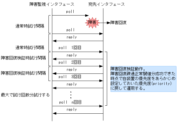VRRPポーリングの障害回復検出の仕組みについて説明します。VRRPポーリングは通常時,通常時試行間隔で指定した間隔でポーリングを行います。疎通不可能状態である場合,応答が返ってくると障害回復検証を行います。障害回復検証では,障害回復検証時試行間隔(構成定義パラメータのrecovery-detection-interval)の指定値(単位:秒)で,試行回数分ポーリングを行います。このとき,障害回復疎通正常判定閾値(構成定義パラメータのrecovery-detection-times)で指定した回数分応答が返ってくるか判定し,この回数を満たした時点で障害回復と判定します。障害回復動作のシーケンスを次の図に示します。