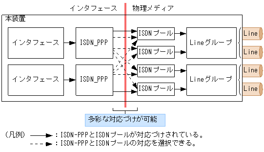 本装置では,ISDNの通信相手を管理する通信相手情報(ISDN_PPP)が使用するISDNプールを任意に選択できます。このため,インタフェースと物理メディアの対応づけの自由度が高く,多彩なネットワークを構築できます。インタフェースと物理メディアの対応づけの概念(ISDN)を次の図に示します。なお,一つのISDN_PPPが同時に複数のISDNプールを選択できません。