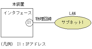 本装置でIPアドレスを付与する単位をインタフェースと呼びます。最も基本的な接続形態では,回線に接続するポートに対して一つのインタフェースを設定します。また,本装置は,フレームリレー,ATMのポイント−ポイント接続およびPVCグループ接続などの,1本の回線に接続するポートに対して複数インタフェースを設定して,接続するネットワークを複数の論理的なネットワークとして扱えます。これらの接続では1個のインタフェースに1個のIPアドレスを設定します。ただし,例外としてイーサネットのマルチホーム接続では,1個のインタフェースに複数のIPアドレスを設定できます。