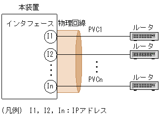 同一物理回線内で1本以上の任意のPVCをグルーピングし,一つのインタフェースとします。この場合,グルーピングされたPVCは同一のIPサブネットに収容されます。インタフェースとIPサブネットの関係を次の図に示します。