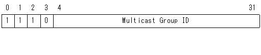 マルチキャスト通信ではIPアドレスのClassDを使用します。マルチキャストアドレスはマルチキャストデータの送受信に参加しているグループの間だけで存在し,論理的なグループアドレスです。アドレスの範囲は224.0.0.0から239.255.255.255です。ただし224.0.0.0から224.0.0.255は予約されたアドレスです。マルチキャストアドレスのフォーマットを次の図に示します。