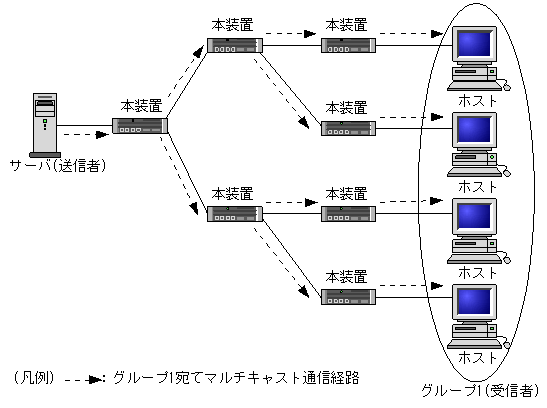 マルチキャストはサーバ(送信者)から各グループ(受信者)にデータを配信する1(送信者):N(受信者)の片方向通信に適します。PIM-DMおよびPIM-SMの適応ネットワーク構成,注意事項を次に示します。なお,DVMRP適応ネットワーク構成は,PIM-DM適応ネットワーク構成と同じです。