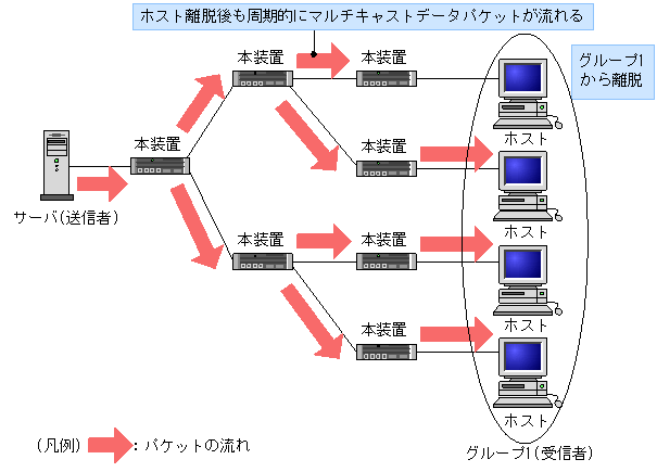 - ホストがマルチキャストグループから離脱したあと,マルチキャストグループが存在しないネットワークにも周期的(約3分)にマルチキャストデータパケットが送信されます。