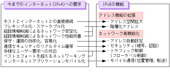 IPv6の基本仕様にはパケットの暗号化やパケットにラベルを付けて通信の優先度を制御する機能や,ネットワークに接続するときにアドレスを自動設定する機能も含まれています。このため,より高品質で高速なネットワーク運用ができます。