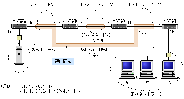IPv4の場合の同一プロトコルによるトンネル禁止構成例を次の図に示します。