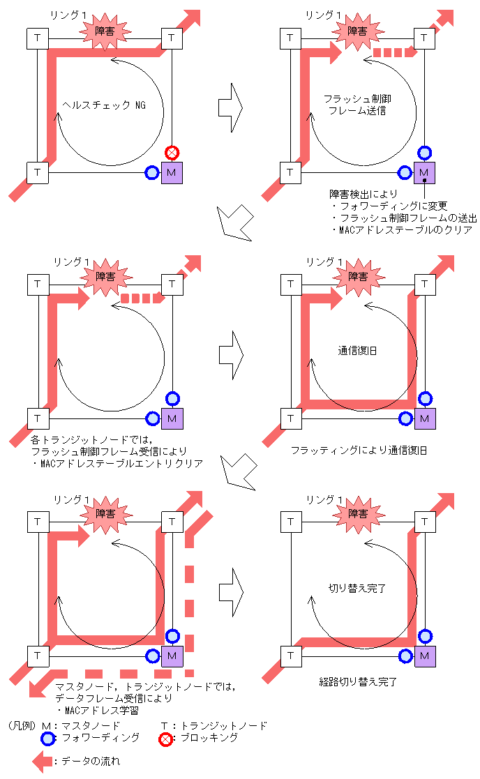 マスタノードは,リング障害の検出による迂回経路への切り替えのために,セカンダリポートをブロッキングからフォワーディングに変更します。また,リング障害の復旧検出による経路の切り戻しのために,セカンダリポートをフォワーディングからブロッキングに変更します。これに併せて,早急な通信の復旧を行うために,リング内のすべてのノードで,MACアドレステーブルエントリのクリアが必要です。MACアドレステーブルエントリのクリアが実施されないと,切り替え(または切り戻し)前の情報に従ってデータフレームの転送が行われるため,正しくデータが届かないおそれがあります。したがって,通信を復旧させるために,リングを構成するすべてのノードでMACアドレステーブルエントリのクリアを実施します。