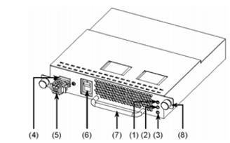 番号 名 称 種 類 状 態 内 容 (1) POWER LED: 緑 電源機構の電源投入状態を示す。 緑点灯: 電源ON。*1消灯 : 電源OFF。 (2) ALM1 LED:赤 電源内部の障害を示す。 赤点灯: 障害検出。*1消灯 : 障害なし。 (3) ALM2 LED:赤 電源内蔵ファンの障害を示す。 赤点灯: 障害検出。*1消灯 : 障害なし。*1 障害の内容によっては,POWER LED,ALM1 LED,ALM2 LEDのどれも点灯しない場合や,ALM2 LEDしか点灯しない場合があります。