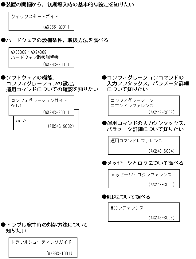 このマニュアルはAX2400Sモデルを対象に記載しています。また,AX2400SのソフトウェアVer. 11.5の機能について記載しています。ソフトウェア機能は,ソフトウェアOS-L2およびオプションライセンスによってサポートする機能について記載します。