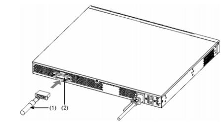 図2-40 予備電源給電ケーブルの取り付け(装置側)(1) 予備電源給電ケーブル(2) 予備電源給電コネクタ(保護キャップ付き)