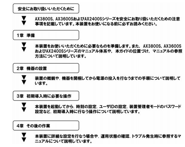 本ガイドは,AX3800S,AX3600SおよびAX2400Sシリーズについて,装置の開梱から,基本的な設定を行うまでの手順について説明しています。