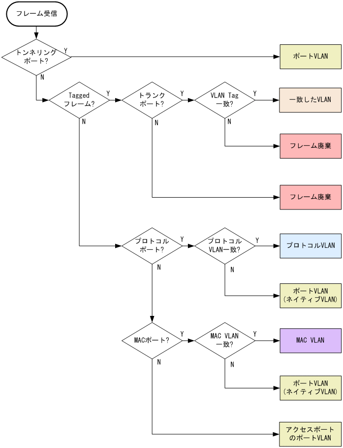 ポートの種類 VLAN判定の優先順位 アクセスポート ポートVLAN プロトコルポート プロトコルVLAN>ポートVLAN(ネイティブVLAN) MACポート MAC VLAN>ポートVLAN(ネイティブVLAN) トランクポート VLAN Tag>ポートVLAN(ネイティブVLAN) トンネリングポート ポートVLAN VLAN判定のアルゴリズムを次の図に示します。