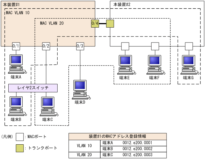 次の図に示す本装置#1の設定例を示します。ポート0/1はMAC VLAN 10を設定します。ポート0/2はMAC VLAN 10および20,0/3はMAC VLAN 20を設定します。ただし,ポート0/3にはMACアドレスを登録していない端末Dを接続しています。