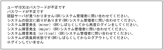 行番号 内容 1行目 ログイン時,ユーザIDまたはパスワード記述を誤った場合,もしくはWeb認証DBによる認証エラーとなった場合に出力するメッセージ。