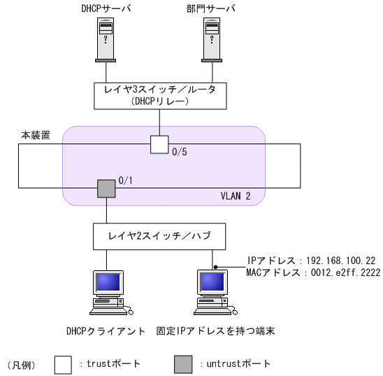 DHCP snoopingの設定は,「13.2.2 基本設定」と同様です。本例では,固定IPアドレスを持つ端末をuntrustポートに接続するため,バインディングデータベースに固定IPアドレスを持つ端末のスタティック登録が必要です。