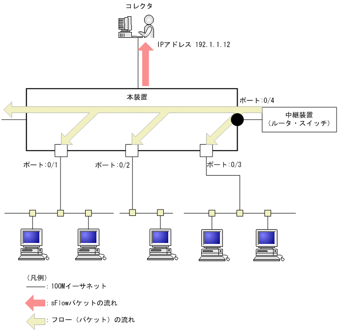 - sFlow統計機能を,受信パケットまたは送信パケットのどちらに対して有効にするかは,インタフェースコンフィグレーションモードで設定するときにsflow forward ingressコマンドまたはsflow forward egressコマンドのどちらを指定するかによって決まります。ここではポート0/2から出て行くパケットをモニタする設定を示します。