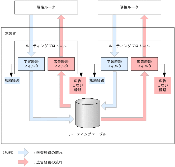 学習経路フィルタリングでは,プロトコルが学習した経路を,プロトコルとルーティングテーブルの間でフィルタします。この機能によって,学習した経路を有効にするかどうかを制御したり,経路の属性値を変更したりできます。