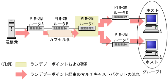 PIM-SMルータAとPIM-SMルータBのIPアドレスを比較してPIM-SMルータBのIPアドレスが大きい場合,PIM-SMルータBがDRとなってランデブーポイントにグループ参加情報の通知を行います。PIM-SMルータDとPIM-SMルータEのIPアドレスを比較してPIM-SMルータEのIPアドレスが大きい場合,PIM-SMルータEがDRとなってランデブーポイントに対してIPカプセル化パケットを中継します。