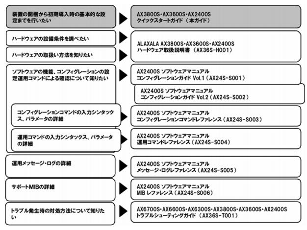 図1-1 AX2400Sシリーズのマニュアル体系図1-2 AX3640SおよびAX3630Sシリーズのマニュアル体系図1-3 AX3800SおよびAX3650Sシリーズのマニュアル体系