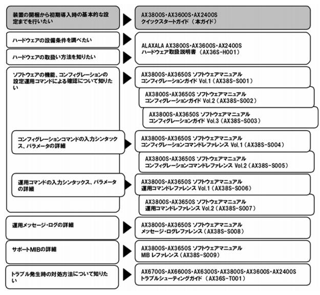 AX3800S,AX3600SおよびAX2400Sシリーズのマニュアル体系を下記に示します。