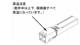 なお,SFP-T,SFP-T(T)を取り外す場合は以下の手順に従ってください。以下の手順に従わないと,やけどの原因となります。・装置の電源を入れたままで取り外す場合は,SFPスロットを閉塞してから5分後に取り外す・装置の電源を切断して取り外す場合は,電源を切断してから5分後に取り外すSFP-T,SFP-T(T)には以下のラベルを貼り付けています。