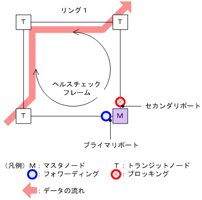 トランジットノードでは,マスタノードが送信するヘルスチェックフレームの監視は行いません。ヘルスチェックフレームを受信すると,リング内の次ノードに転送します。データフレームの転送は,両リングポートで行います。