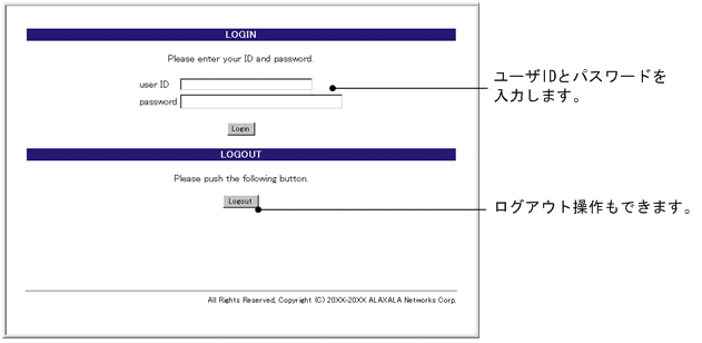 - Web認証専用IPアドレスのログアウトURL:http://Web認証専用IPアドレス/logout.html
