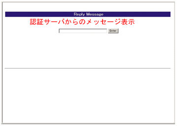 </tbody>認証サーバから送られてくるメッセージを表示するための記述です。この記述は変更しないでください。 <form name="Process" method="post" action="/cgi-bin/Process.cgi"> Reply-Message表示に対する操作をWeb認証に指示するための記述です。この記述は変更しないでください。 <input name="scode" type="hidden" value="<!-- Session_Code -->"> この記述は変更しないでください。 <input name="pcode" size="40" maxlength="32" autocomplete="OFF" type="password"> メッセージに対するデータを指定するための記述です。sizeとmaxlength以外の記述は変更しないでください。<form></form>の内部に設定してください。また,maxlengthは必ず6以上の数字を設定してください。 <input value="Enter" type="submit"> Web認証に要求を行うための記述です。この記述は変更しないでください。<form></form>の内部に設定してください。
