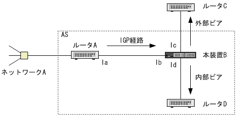 MP_REACH_NLRI属性のネクストホップにはIGP経路が解決するネットワークAへのネクストホップアドレスである,ルータAのインタフェースアドレスIaが設定されます。ただし,Iaがリンクローカルアドレスの場合,MP_REACH_NLRI属性のネクストホップには,本装置BとルータD間のインタフェースの,本装置B側のグローバルアドレスIdが設定されます。